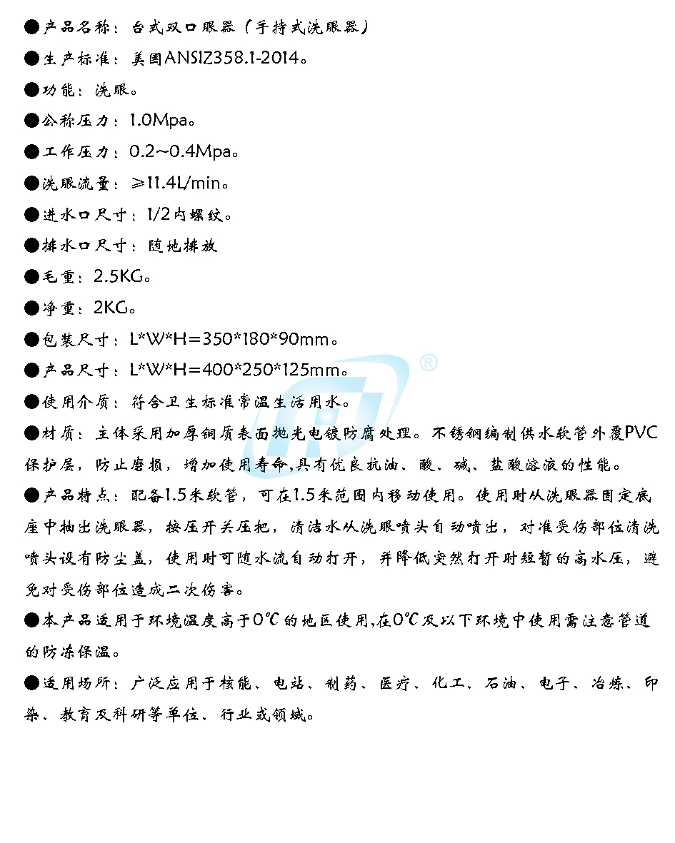 • 执行标准: ANSI Z358.1-2014
